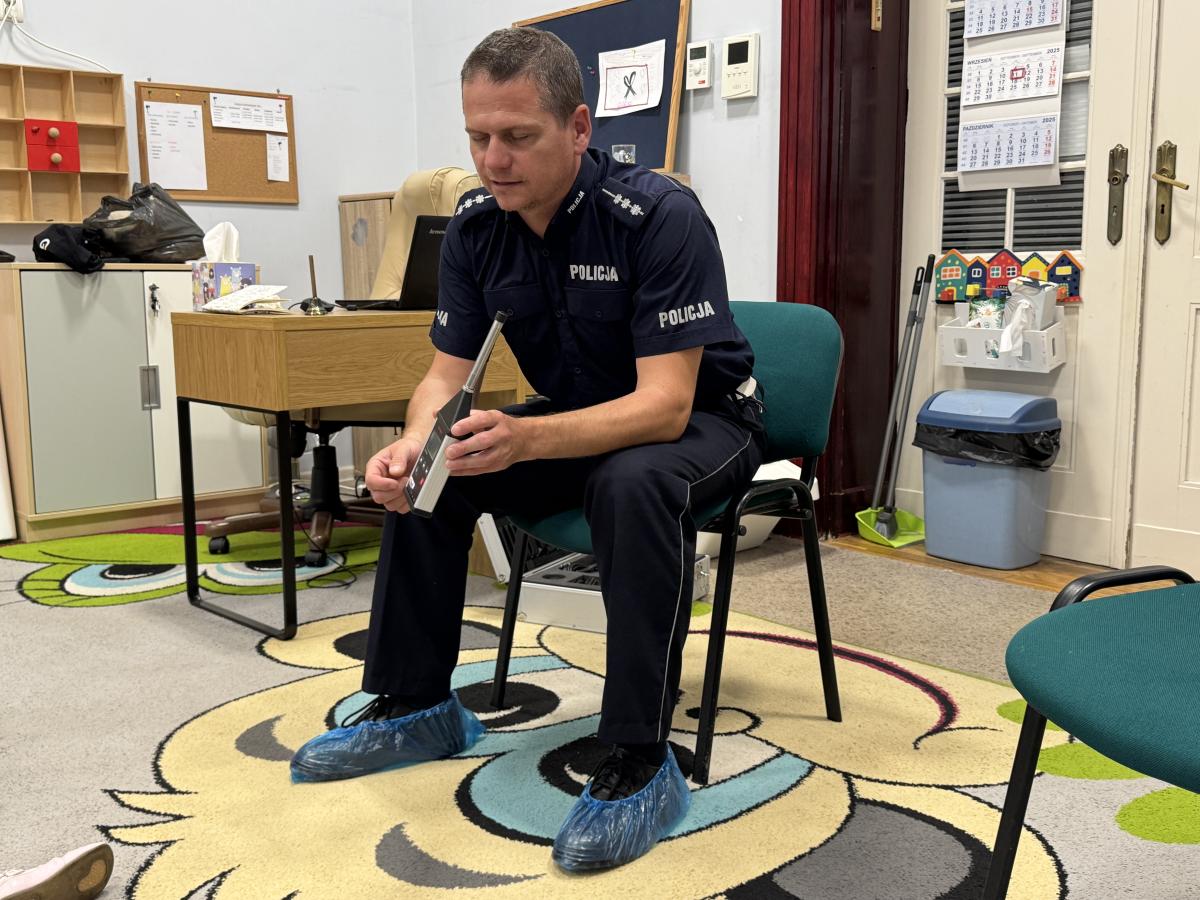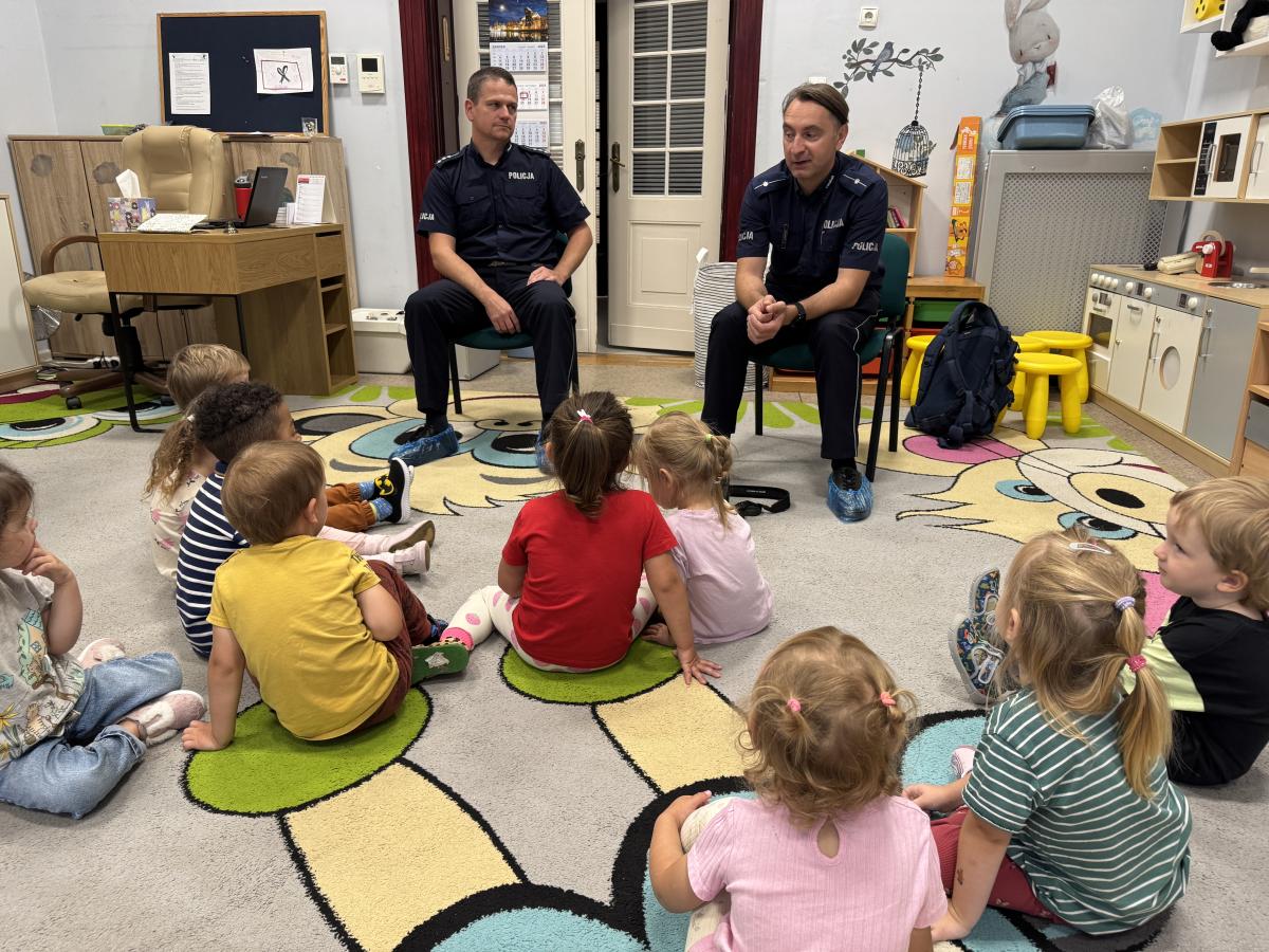 W dniu 11.09.2025 r. przedszkolaków z gr. I odwiedzili Policjanci. W czasie spotkania mówili o konieczności noszenia jasnych ubrań widocznych po zmierzchu, przechodzenia przez jezdnię na pasach, zapinaniu pasów i korzystaniu z fotelików w samochodzie, również o trzymaniu rodziców za rękę. Policjanci pokazali dzieciom urządzenie do mierzenia głośności pojazdów. Dzieci z zainteresowaniem słuchały nowych treści.